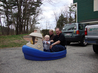 My parents got a Tugboat sandbox for Sean. Its really cute and Sean thinks its great. He loves to climb in side, even without any sand and play around in it. While I was visiting my parents last weekend I ran out to the store for a minute and came back to a very funny scene.